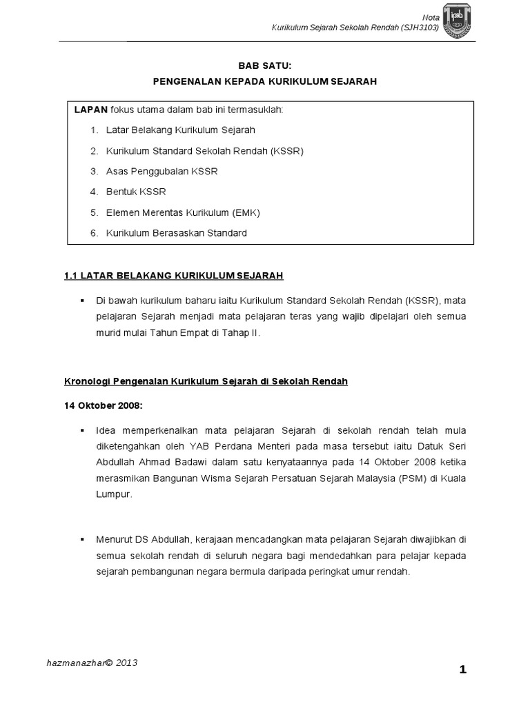 Nota Sjh3103 Kurikulum Sejarah Sekolah Rendah Bab 1