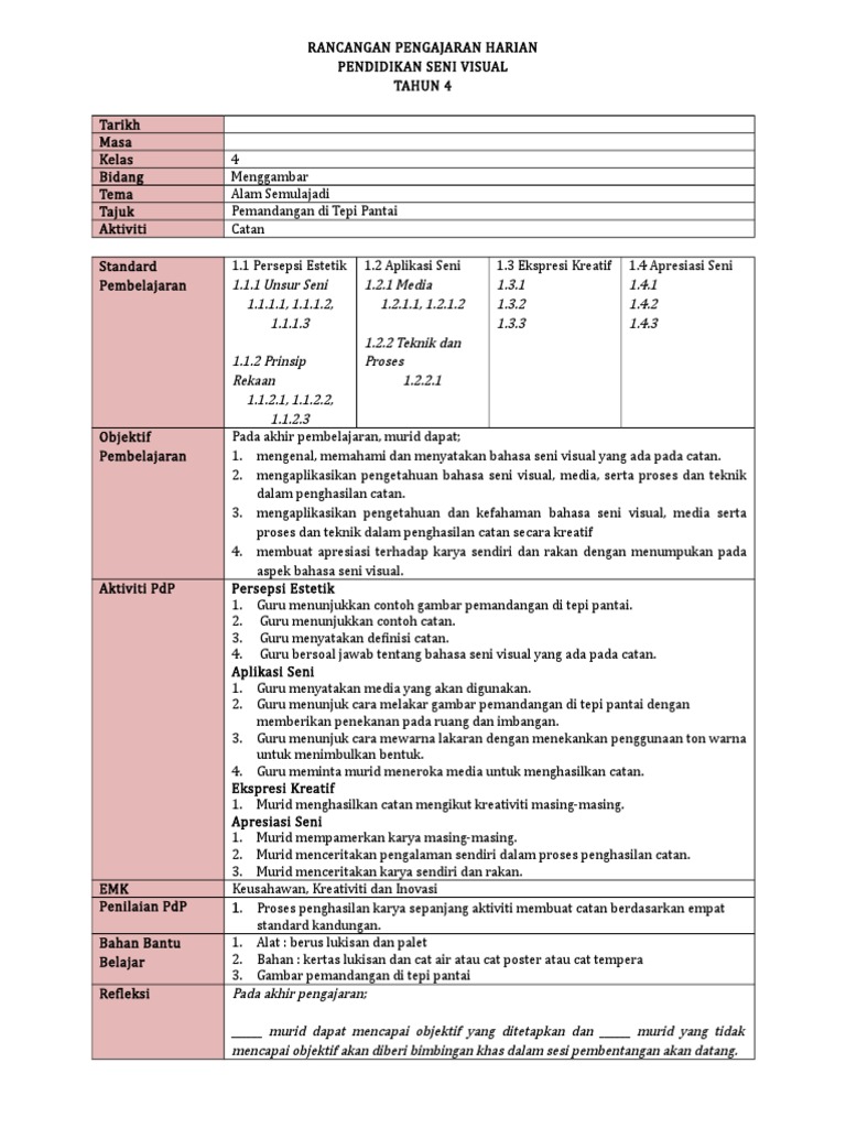 Psv Rancangan Pengajaran Harian Kssr Seni Tahun 4