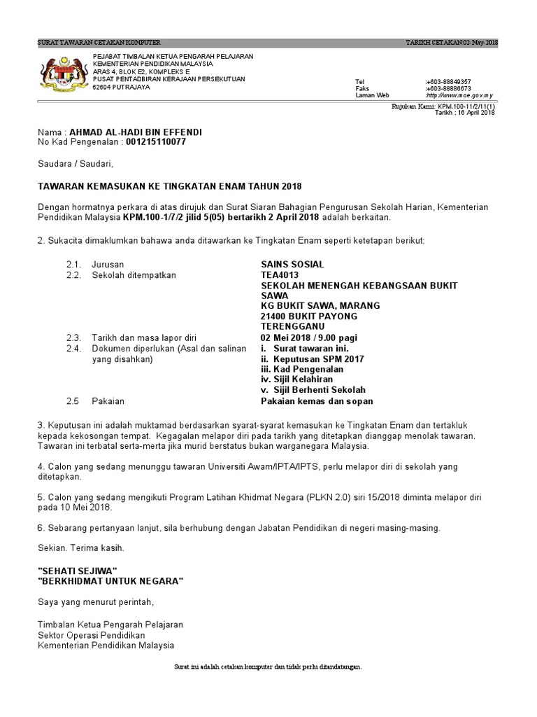 Surat Tawaran Tingkatan 6 Cetakan Komputer